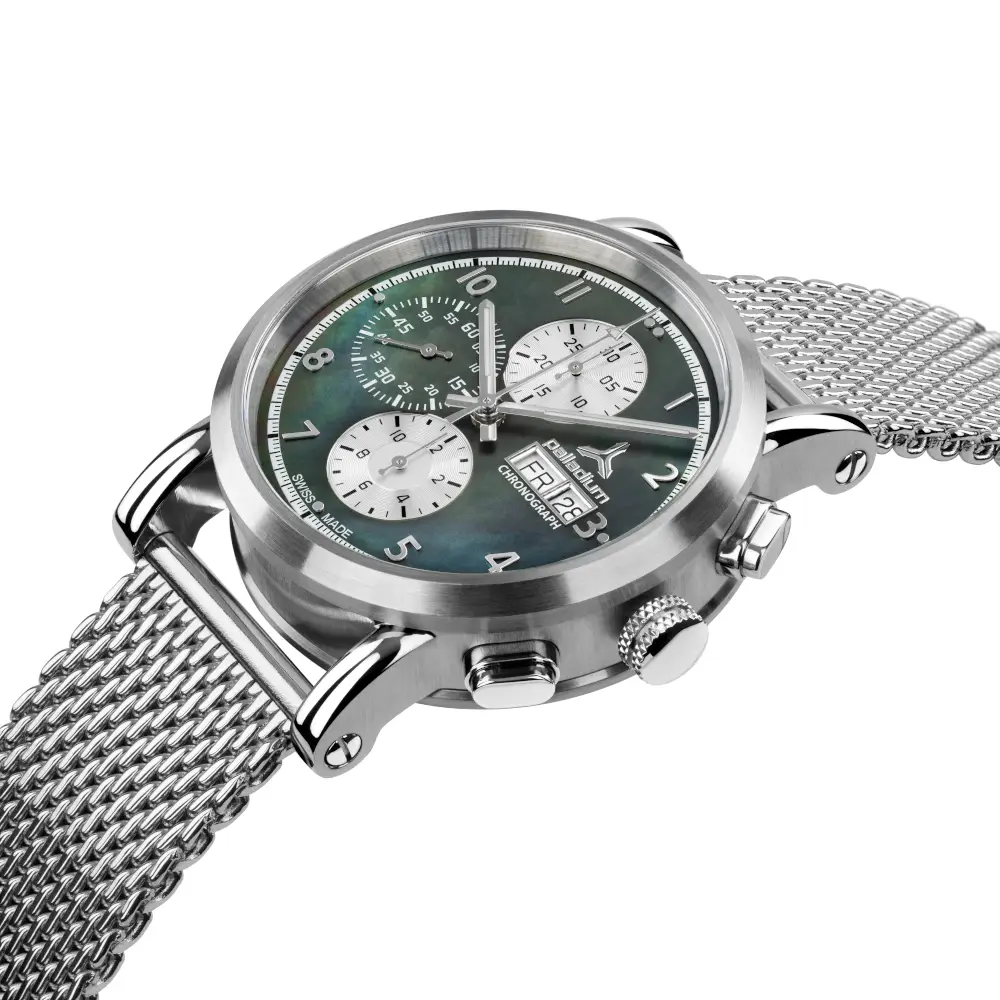Das edle, kunstvoll dekorierte ETA-7750-Uhrwerk findet im Modell Nacre Chronograph seinen Platz in einem fein komponierten, dreiteiligen Gehäuse. Die klare Linienführung wird durch präzise ausgeführte Oberflächenveredelungen wirkungsvoll hervorgehoben.