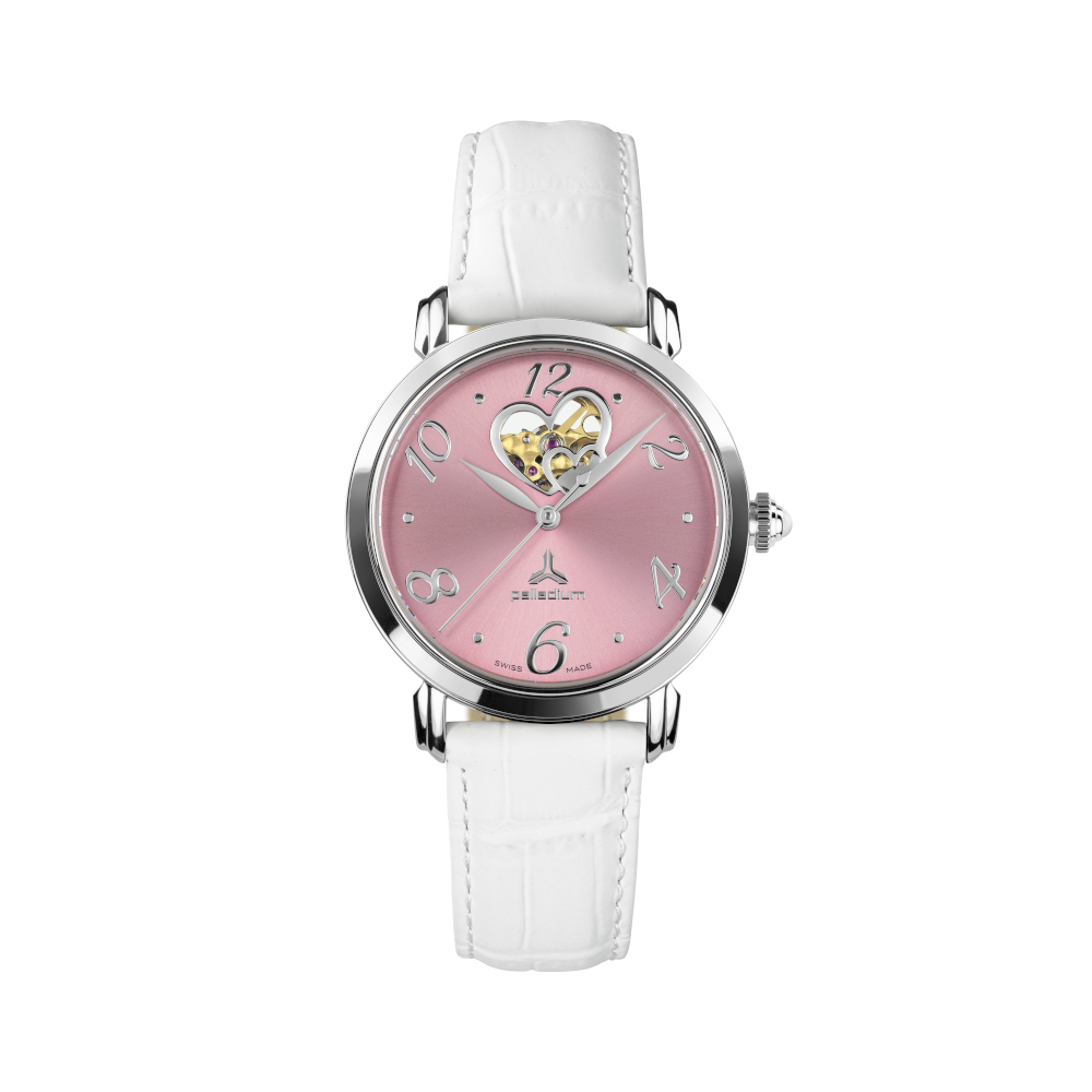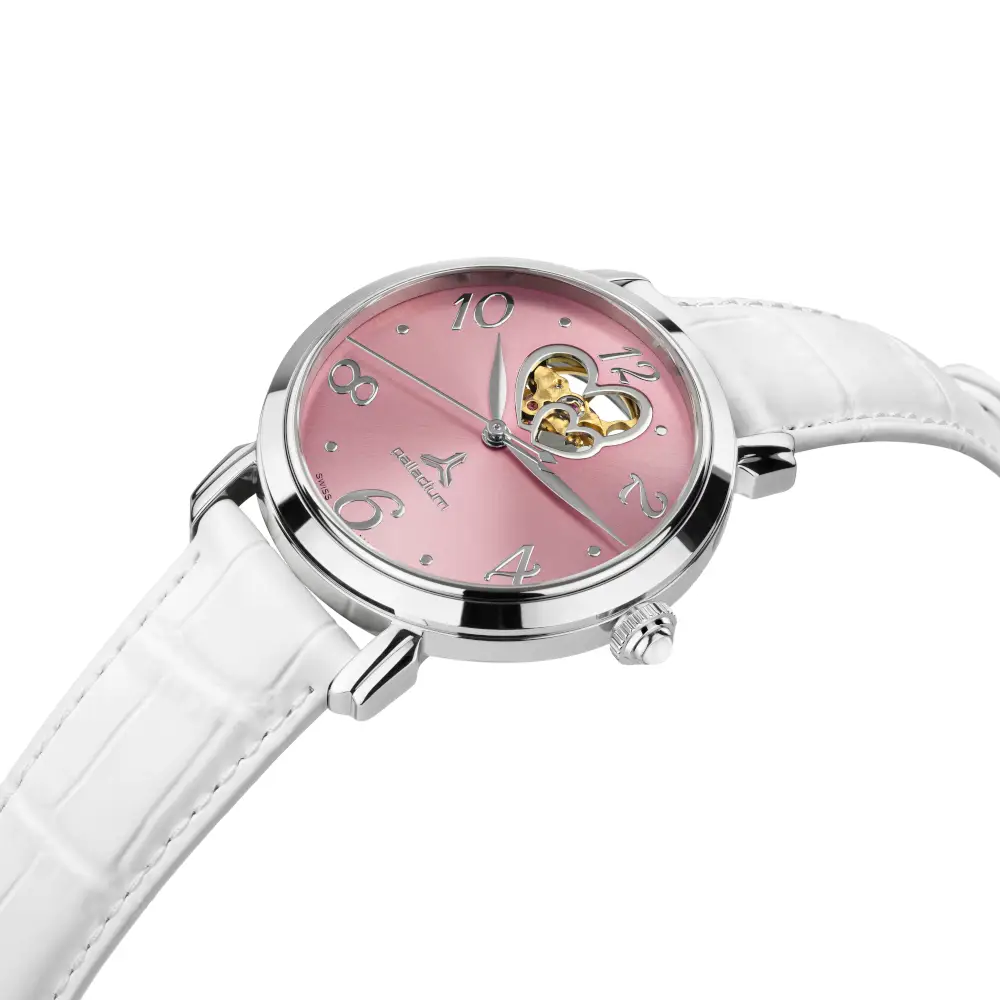 Das glänzende Zifferblatt verleiht der Uhr eine edle Ausstrahlung und fängt das Licht bei jeder Bewegung auf besondere Weise ein. Ein liebevoll gestaltetes Detail bildet die herzförmige Aussparung im Zifferblatt. Durch dieses Herz eröffnet sich ein Blick auf das schlagende Herz der Uhr – die sich rhythmisch bewegende Spirale des Uhrwerks. Dieses kleine mechanische Schauspiel macht jede Sekunde sichtbar und verleiht der Uhr eine ganz besondere Lebendigkeit.