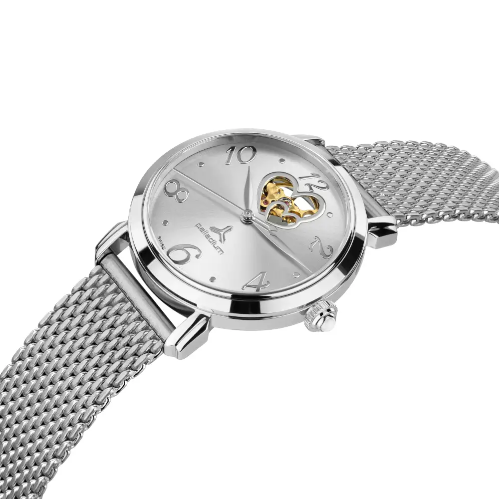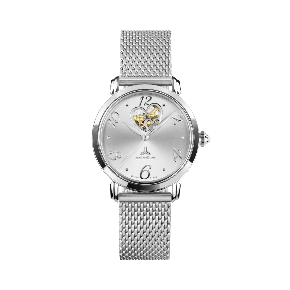 Das glänzende Zifferblatt verleiht der Uhr eine edle Ausstrahlung und fängt das Licht bei jeder Bewegung auf besondere Weise ein. Ein liebevoll gestaltetes Detail bildet die herzförmige Aussparung im Zifferblatt. Durch dieses Herz eröffnet sich ein Blick auf das schlagende Herz der Uhr – die sich rhythmisch bewegende Spirale des Uhrwerks. Dieses kleine mechanische Schauspiel macht jede Sekunde sichtbar und verleiht der Uhr eine ganz besondere Lebendigkeit.