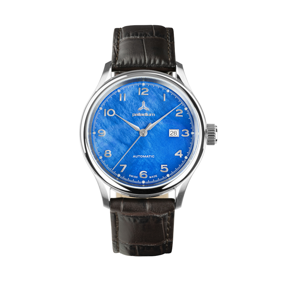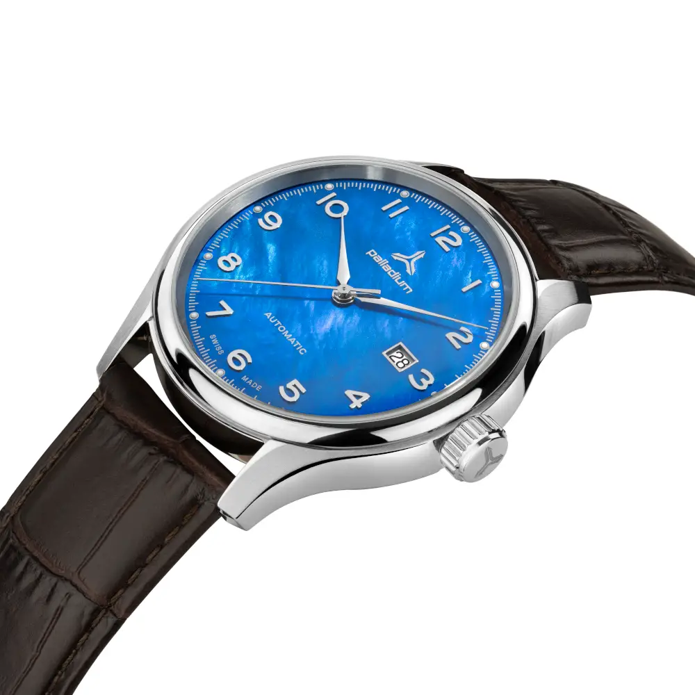 Die Palladium Nacre entfaltet ihre besondere Ausstrahlung durch ein Zifferblatt aus echtem Perlmutt, dessen lebendiges Farbenspiel jeden Blick zu einem kleinen Erlebnis macht.
