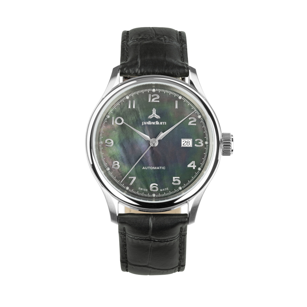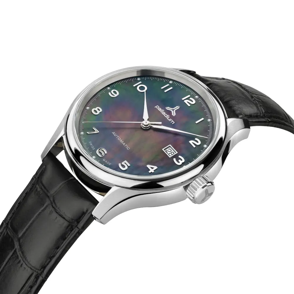 Die Palladium Nacre entfaltet ihre besondere Ausstrahlung durch ein Zifferblatt aus echtem Perlmutt, dessen lebendiges Farbenspiel jeden Blick zu einem kleinen Erlebnis macht.