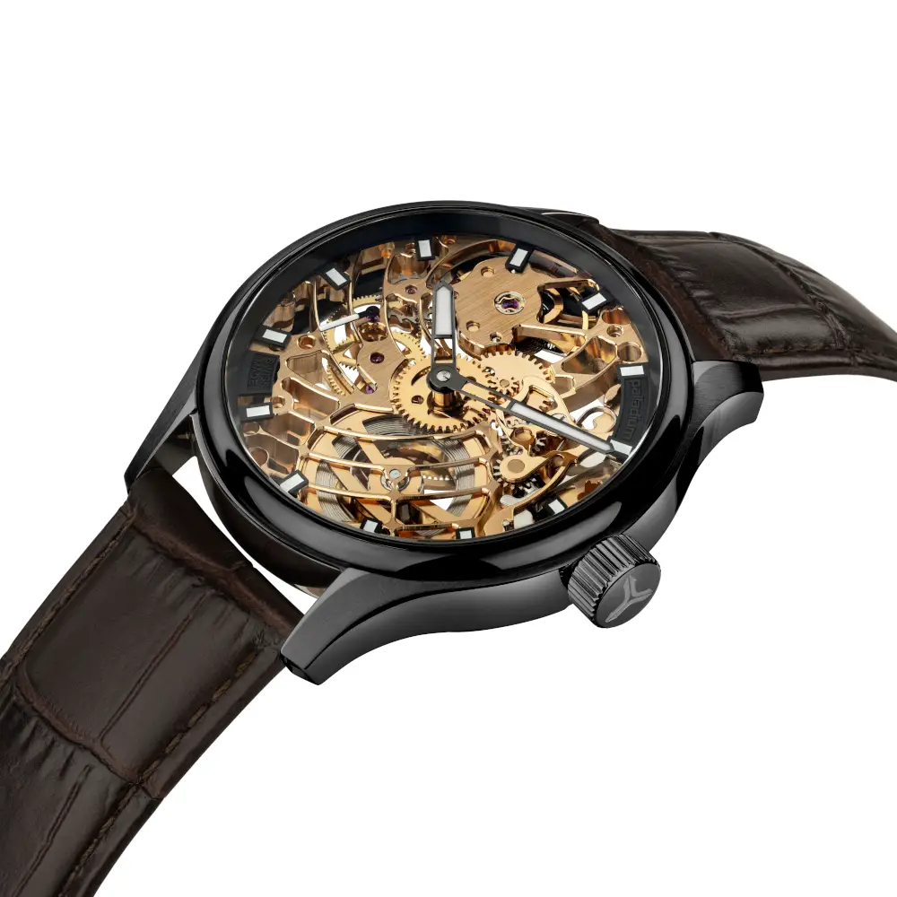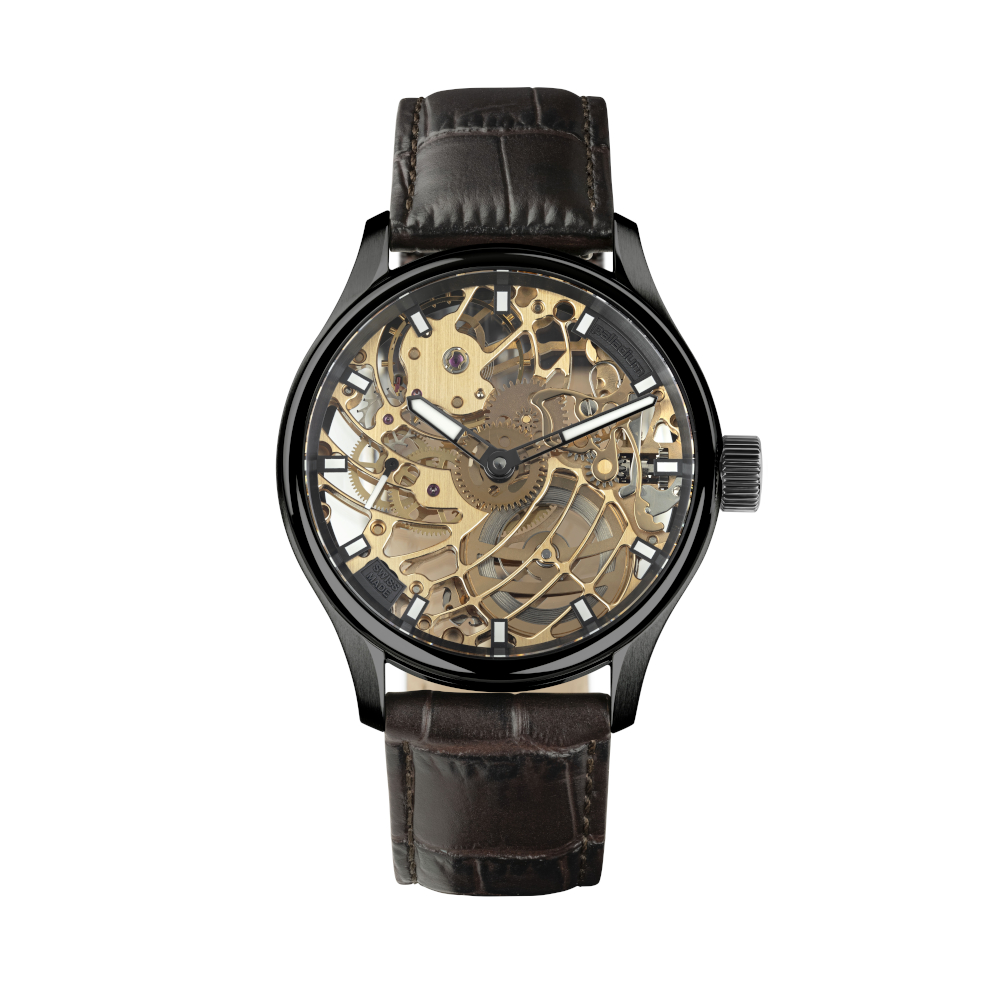 Das Modell Squelette überzeugt mit einem fein skelettierten Handaufzugswerk ETA 6497, das einen faszinierenden Blick auf die mechanische Präzision der Uhr erlaubt. Dieses traditionsreiche Werk, das bereits seit seiner Markteinführung in den 1950er-Jahren in Taschenuhren Verwendung findet, wird von Hand aufgezogen und bietet dank seines grosszügigen Durchmessers ideale Voraussetzungen für eine kunstvolle Skelettierung.