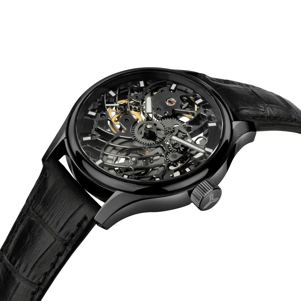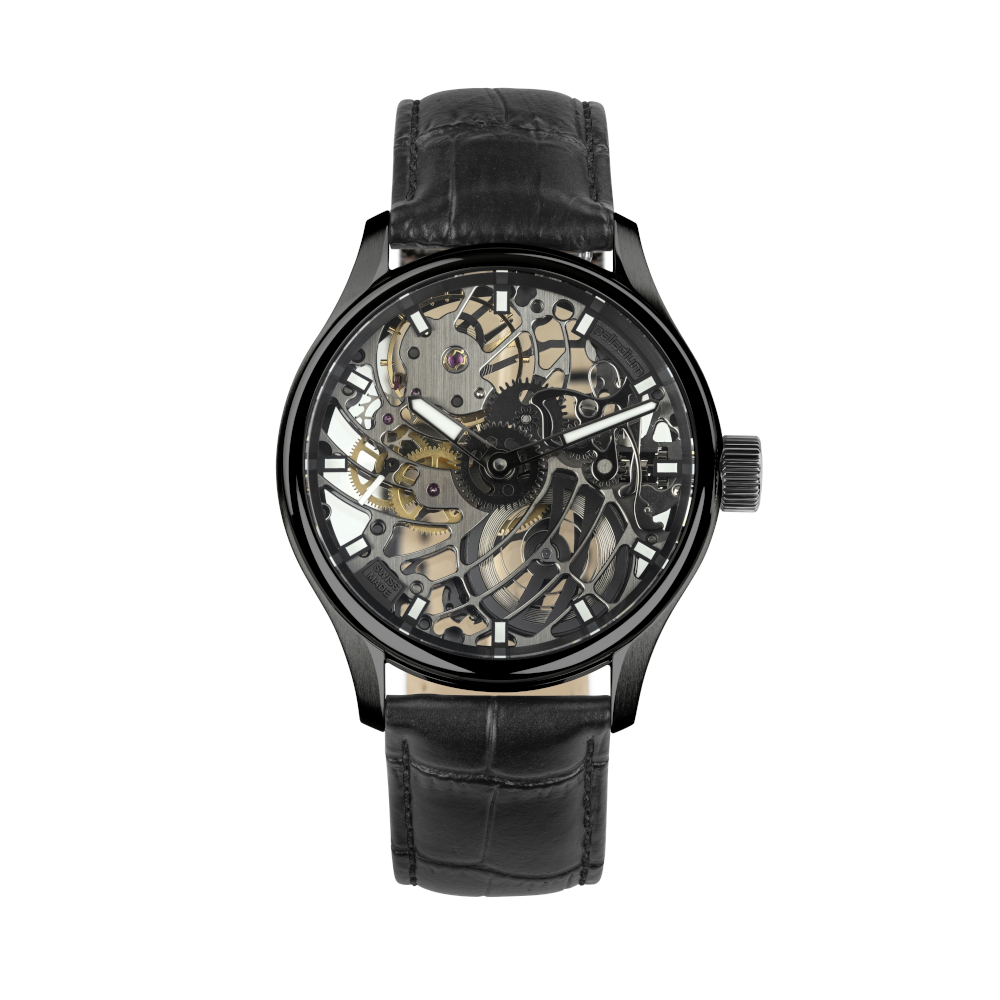Das Modell Squelette überzeugt mit einem fein skelettierten Handaufzugswerk ETA 6497, das einen faszinierenden Blick auf die mechanische Präzision der Uhr erlaubt. Dieses traditionsreiche Werk, das bereits seit seiner Markteinführung in den 1950er-Jahren in Taschenuhren Verwendung findet, wird von Hand aufgezogen und bietet dank seines grosszügigen Durchmessers ideale Voraussetzungen für eine kunstvolle Skelettierung.
