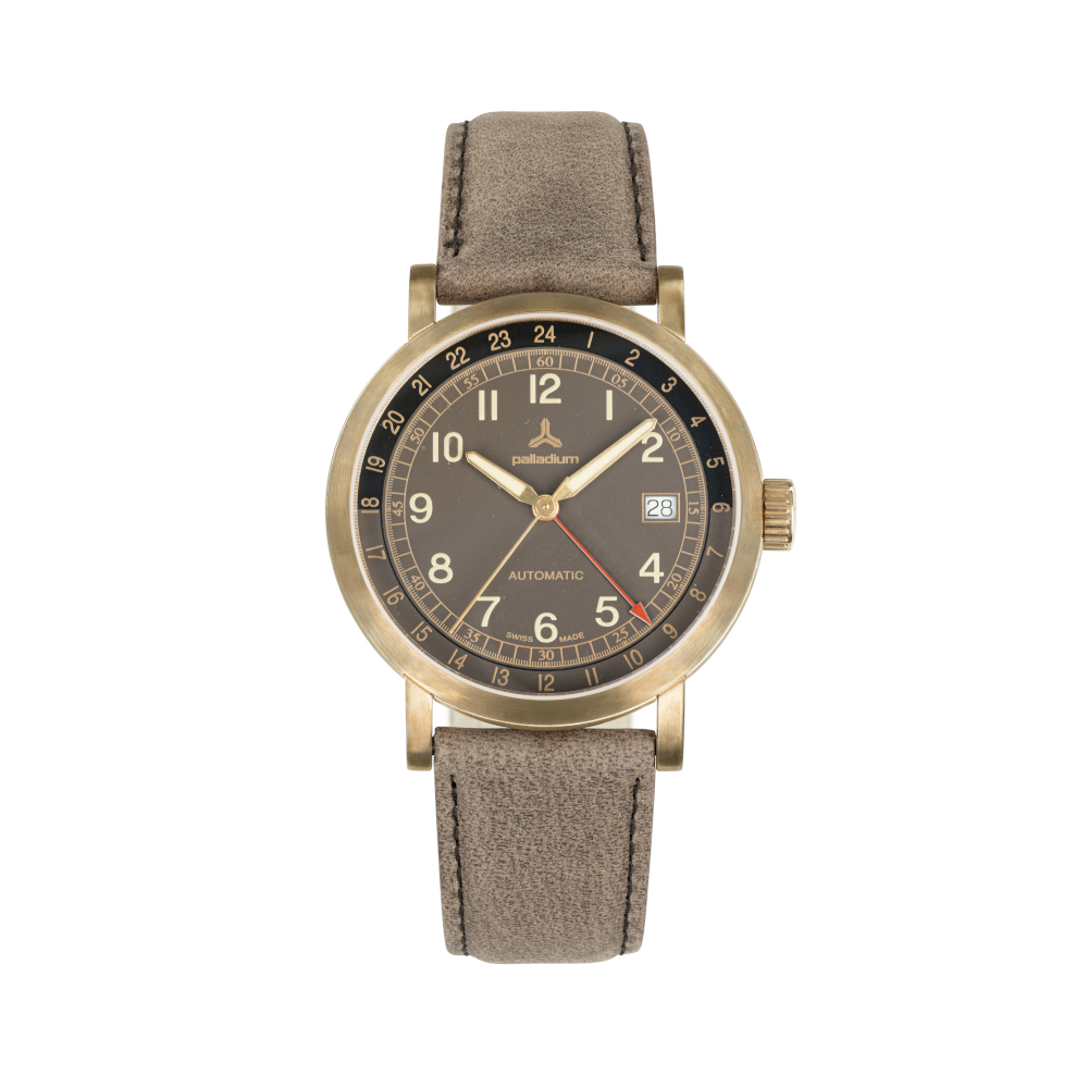 Entdecke unsere exklusive Bronze-GMT-Uhr – ein Zeitmesser, der mit dir lebt. Das Gehäuse aus massiver Bronze entwickelt mit der Zeit eine einzigartige Patina und macht jede Uhr zum unverwechselbaren Einzelstück.