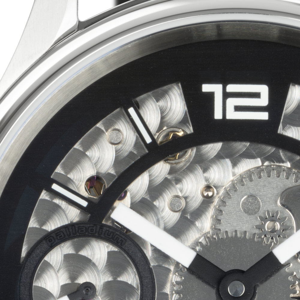 Perlage silber Palladium beschichtet – direkt auf die Platine des Uhrwerks perliert.