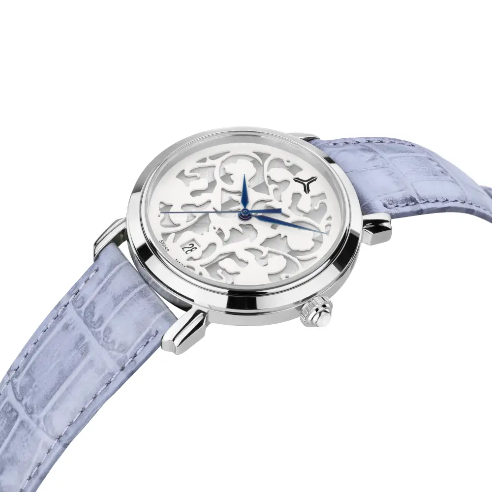 Feine Genfer Streifen auf dem Ziffernblatt unterstreichen die hochwertige Verarbeitung und verleihen der Uhr einen Hauch klassischer Uhrmacherkunst – stilvoll, klar und zeitlos feminin.