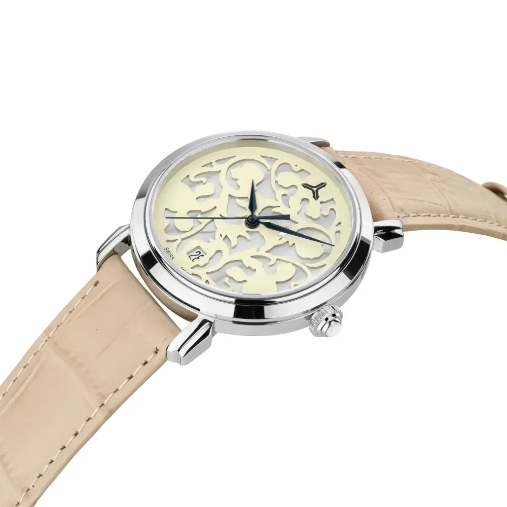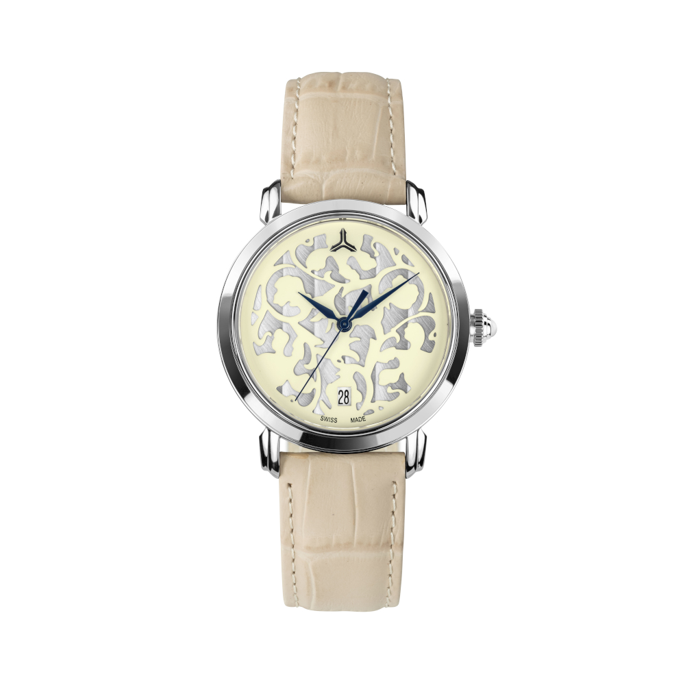 Feine Genfer Streifen auf dem Ziffernblatt unterstreichen die hochwertige Verarbeitung und verleihen der Uhr einen Hauch klassischer Uhrmacherkunst – stilvoll, klar und zeitlos feminin.