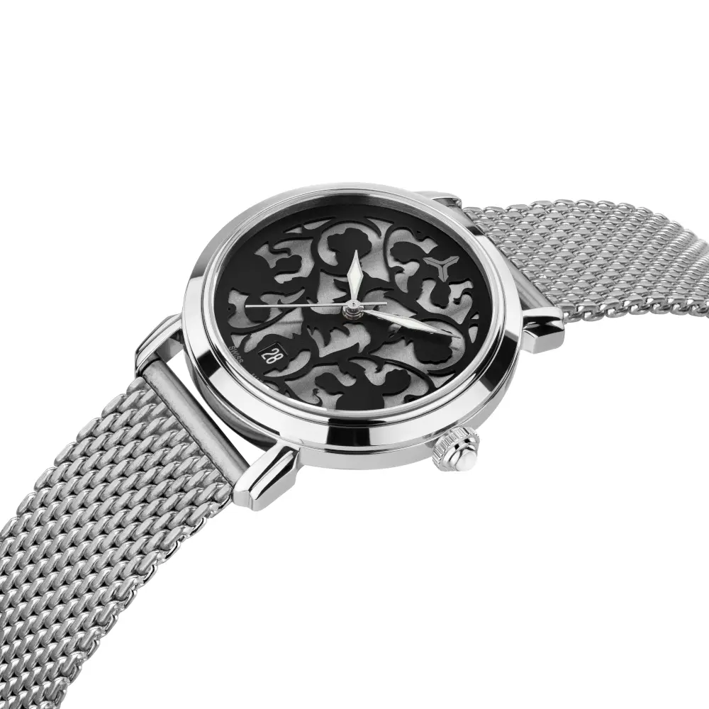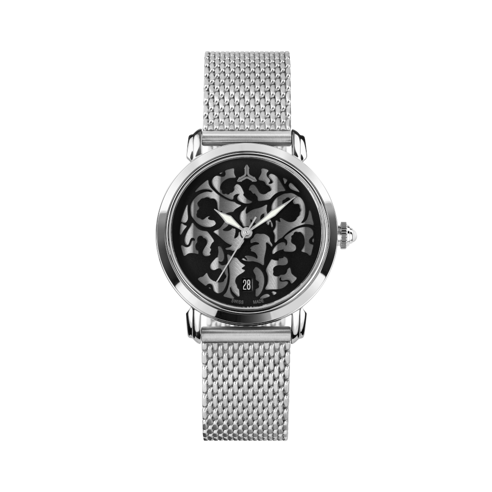 Feine Genfer Streifen auf dem Ziffernblatt unterstreichen die hochwertige Verarbeitung und verleihen der Uhr einen Hauch klassischer Uhrmacherkunst – stilvoll, klar und zeitlos feminin.
